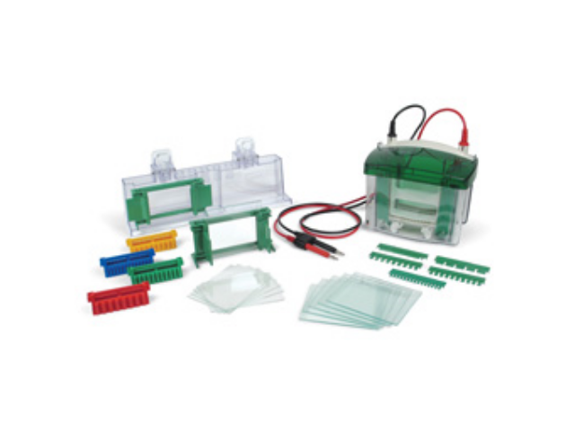 Вертикальная система электрофореза с 4 гелями, толщина геля 0,75 мм, включает литейную стойку, 2 литейные рамки, 10-луночные гребни, 5 коротких планшетов и 5 дистанционных планшетов.