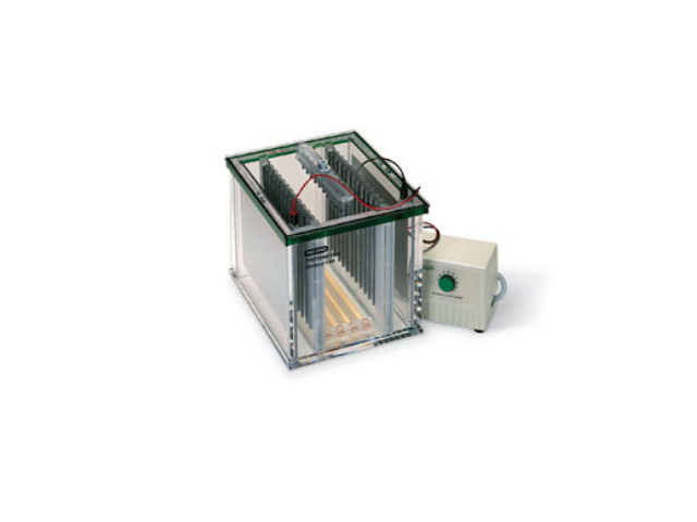 Широкоформатная вертикальная ячейка для электрофореза до 12 гелей. Включает буферный бак с охлаждающим сердечником, крышкой, рециркуляционным насосом с трубкой и 2 гелевыми разделителями.