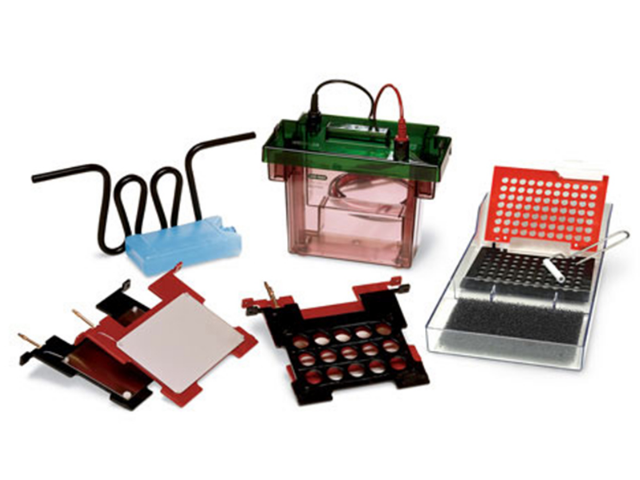 Камера для проведения электроблоттинга в «мокром» формате Criterion Blotter позволяет работать с гелями и мембранами размером до 15 х 9,4 см. Система выпускается в двух вариантах комплектации: с проволочными или пластинчатыми стальными электродами. Последние обеспечивают, по сравнению с проволочными, равномерное электрическое поле в зоне переноса и снижают вероятность возникновения искривлений и «краевых» эффектов. Замораживаемый охлаждающий модуль, идущий в комплекте позволяет поддерживать невысокую температуру буфера во время переноса. Дополнительно приобретаемый охлаждающий змеевик может обеспечить более эффективное охлаждение раствора в случае его сильного нагрева. Кассетные держатели для гелей с мембранами со специальными мягкими прокладками обеспечивают равномерное давление на всей площади переноса. Рекомендуется использовать систему с источником питания Bio-Rad PowerPac HC для обеспечения высоких значений тока, необходимого для осуществления блот-переноса.