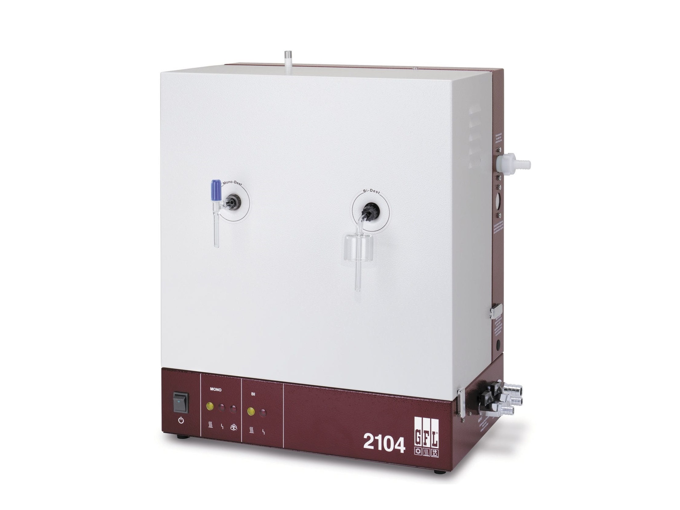 Для изготовления бидистиллятора GFL-2104 используется комбинация высококачественной стали и стекла. Он не имеет накопительного резервуара. При полной автоматизации производительность составляет четыре литра дистиллята в час.