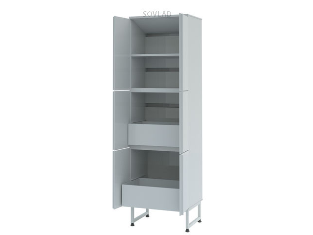 Шкаф из полипропилена для хранения кислот и щелочей содержит 2 выдвижных ящика, которые располагаются в отделах с дверцами. Также есть отделение с 2-мя полками.