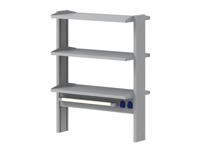 3 полки в алюминиевых рамках, блок электророзеток, люминесцентная лампа.