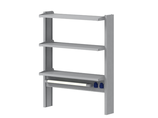 3 полки в алюминиевых рамках, блок электророзеток, люминесцентная лампа.