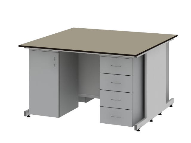 Низкий островной стол для лаборатории оснащается рабочими поверхностями из таких материалов: ламинат, trespa, керамогранит, нержавейка, durcon. Имеет стандартную высоту 750 мм.