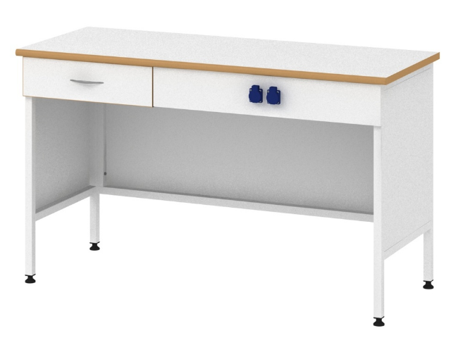 В основе стола с электрооборудованием 1500СЭ - лабораторный высокий стол СОВЛАБ-1500 СЛв. На него установлена рабочая поверхность размером 1500х600 мм. Под рабочей поверхностью с левой стороны в столе расположен выдвижной ящик на шариковых направляющих полного выдвижения длиной 500 мм. С правой стороны на фасадной панели установлены две влагозащищенные розетки 220 вольт.