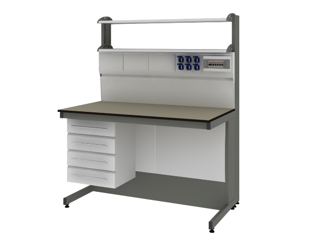 Стойки изготовлены из высококачественного алюминиевого сплава. Под нижней полкой расположена сегментная сервисная панель. Каждый сегмент представляет быстросъемную панель. Панели закрывают доступ к коммуникациям и предназначены для размещения на них различного инженерного оборудования. На одной панели в штатной комплектации стеллажа расположены три пыле- влагозащищенные розетки на 220 вольт, закрывающиеся крышками. На другой панели установлен автомат аварийного отключения питания 16А. лабораторной посуды.