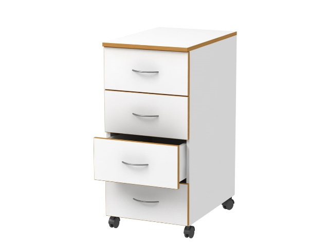Высокие и низкие подкатные тумбы — выполнены из белой влагозащищенной ламинированной ДСП. Углы усилены кромочным ABS-пластиком. В вариантах с выдвижными ящиками применяются мебельные шариковые направляющие для ящиков полного выдвижения. В ассортименте представлены различные конфигурации: с дверью, 1, 2, 3, 4 выдвижными ящиками.