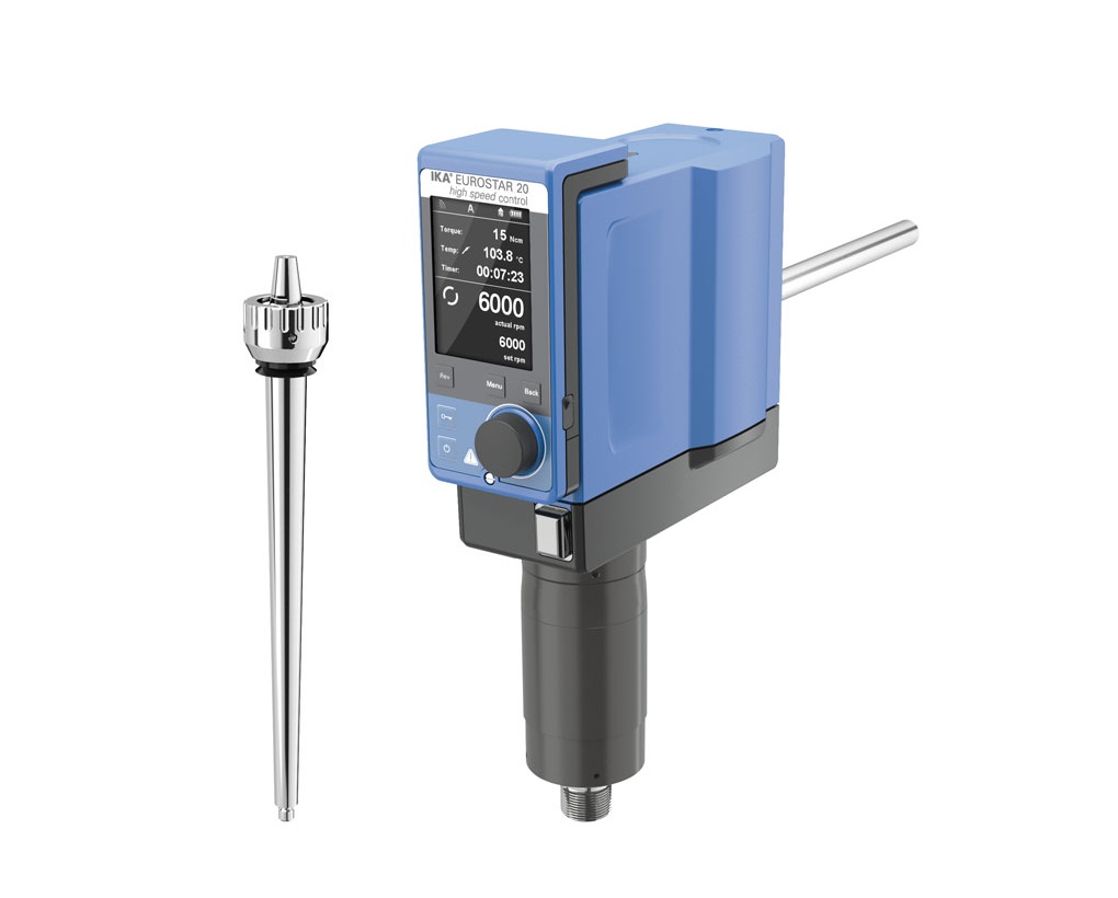 Высокоскоростная лабораторная мешалка IKA EUROSTAR 20 high speed control оборудованная съёмным беспроводным контроллером и цифровым TFT-дисплеем, автоматическим регулированием частоты вращения с помощью микропроцессора в диапазоне скоростей от 0/150 до 6000 об / мин.