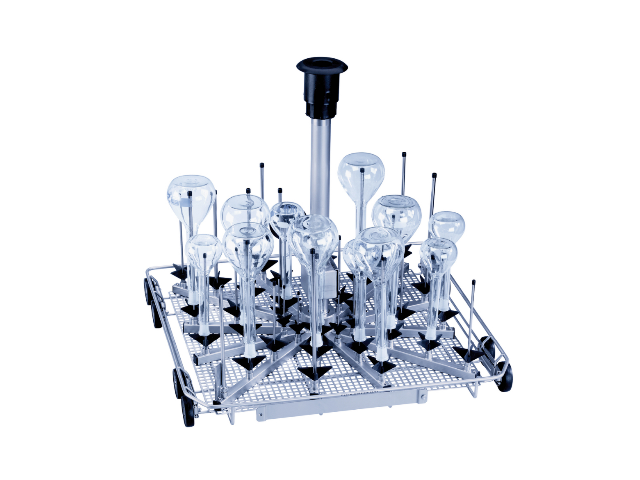 Тележка для оптимальной загрузки стеклянной посуды с узким горлышком.