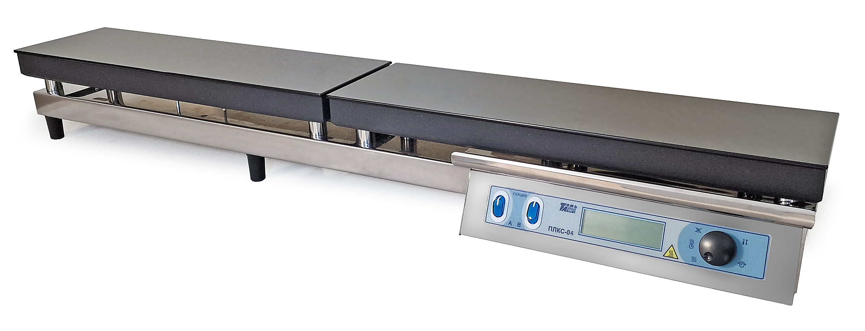 Плита ПЛКС-04 имеет графический дисплей, на котором отображаются текущая и заданная температура нагревательных поверхностей, а также заданное время и время до окончания нагрева.