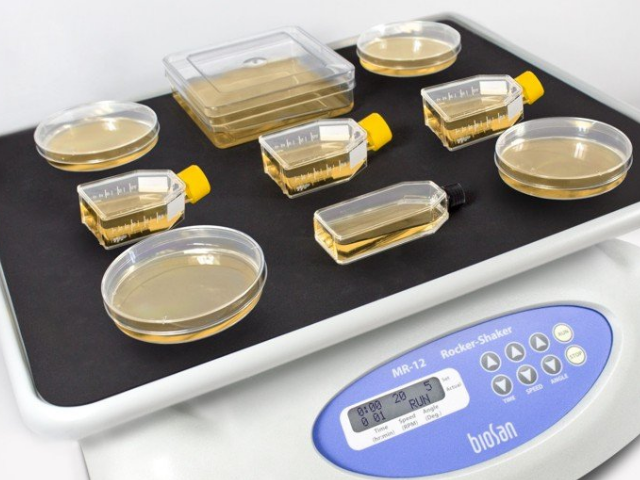Рокер-шейкер MR-12 обеспечивает как мягкое, так и интенсивное перемешивание растворов или питательных сред в сосудах или пластиковых мешках, размещенных на его платформе. Регулируемая скорость и угол покачивания платформы обеспечивают возможность подобрать параметры для оптимальной массопередачи и перемешивания. Идеален для отмывки гелей после электрофореза, при подготовке (гомогенизации) биоэкстракционной смеси. Оптимален для гибридизации биомолекул на полосках бумаги (стрипов), покраски и отмывки стрипов. Установленный в биоинкубатор прибор идеально подходит для выращивания клеток и клеточных культур в одноразовых пластиковых мешках-реакторах (рабочие объемы до 10 литров, объем жидкости до 5 литров).