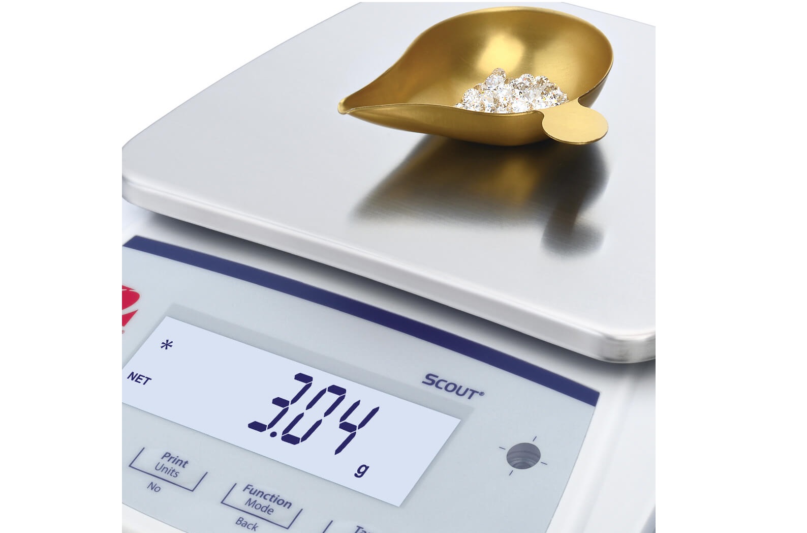 Портативные весы OHAUS серии Scout SJX класса точности II, сертифицированные для торговых операций, идеальны для взвешивания ювелирных изделий.