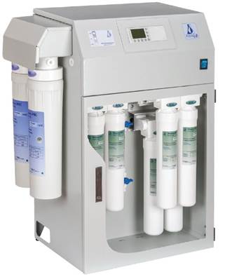 Система Аквалаб-1 double, предназначенная для получения воды II типа, со скоростью потока 6 л/ч, рассчитанная на высокое солесодержание исходной воды.
