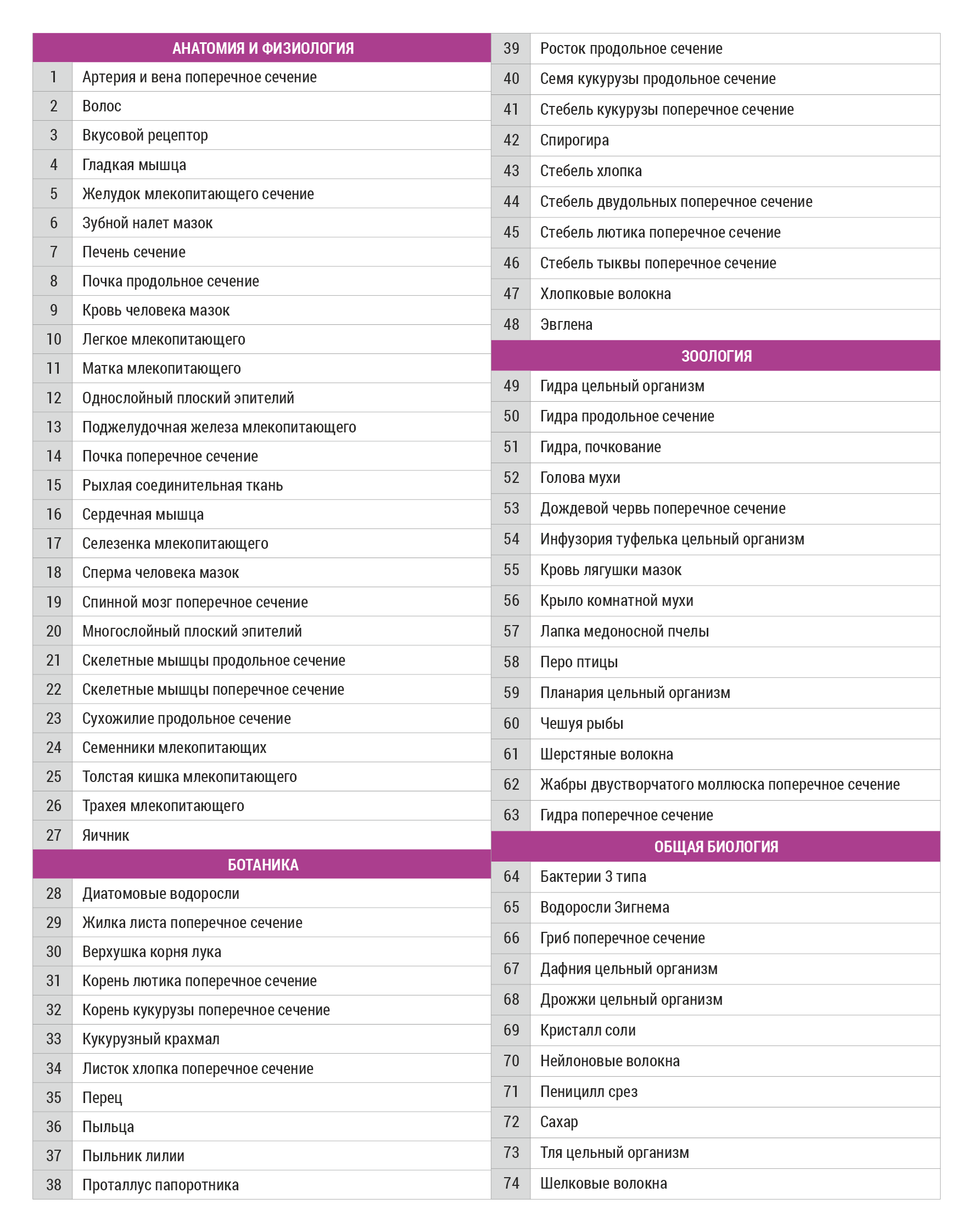 5) 74 готовых микропрепарата (27 относятся к теме «Анатомия и физиология», 21 — к теме «Ботаника», 15 — к теме «Зоология», 11— к теме «Общая биология»).