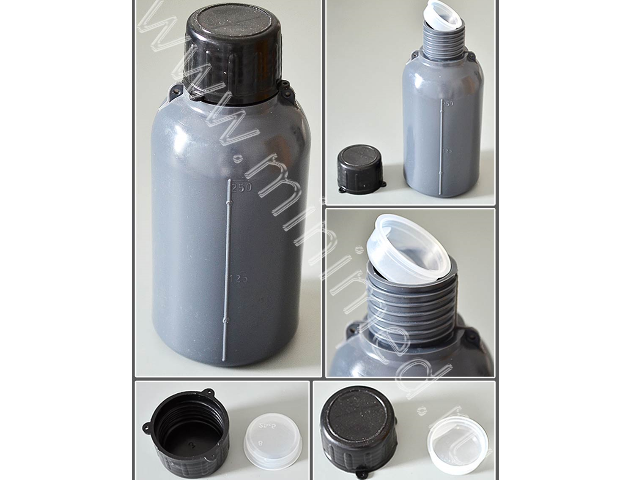 Бутылка изготовлена из полиэтилена серого цвета, подходит для хранения веществ, чувствительных к действию света, снабжена вкладышем, обеспечивающим герметичность, и специальными петельками, которые можно использовать для пломбировки или крепления информационных табличек. Градуированная. Устойчива к действию щелочей любых концентраций, органических кислот, концентрированных соляной и плавиковой кислот; разрушается азотной кислотой, хлором и фтором. Автоклавированию не подлежит.