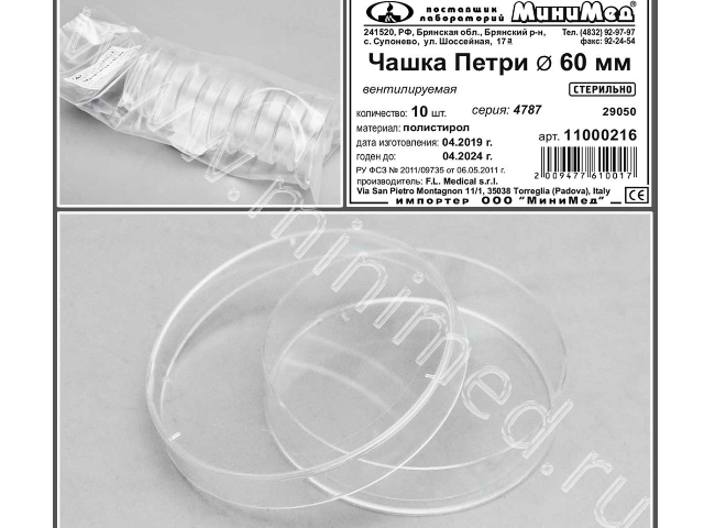 Чашка Петри диам.60, стер., п/с,уп.10/1000шт.