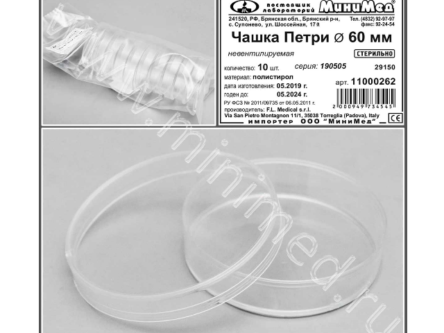Чашка Петри, Ø 60 мм, невентилируемая, стерильная, п/с, уп.10 шт.,кор.1000 шт