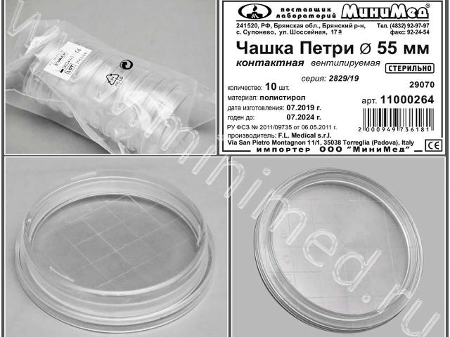 Чашка Петри, контактная, диаметр 55 мм, стер., вентилир.,п/с,уп.10/кор.1000 шт