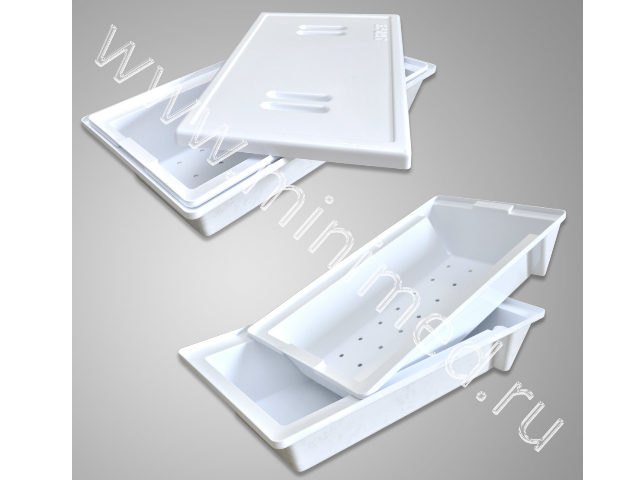 Предназначен для предварительного замачивания и дезинфекции изделий медицинского назначения (габаритные хирургические инструменты, наркозо-дыхательная аппаратура). Изготовлен из ударопрочного, химически стойкого полистирола голубого цвета. На боковой поверхности перфорированного поддона есть градуировка объема в литрах - нет необходимости отмерять дезинфицирующий раствор. Крышка контейнера надежно защищает медицинский персонал от вредных испарений.