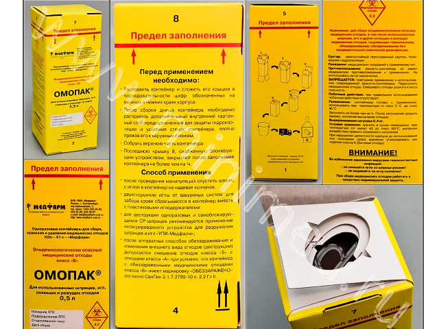 Контейнер для сбора медицинских отходов, в том числе колющих и режущих класса «Б», изготовлен из специального многослойного прессованного непрокалываемого картона толщиной не менее 1 мм и не более 1,5 мм.
