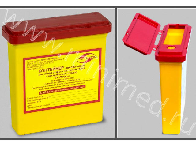 Предназначен для сбора и хранения использованного острого инструментария, игл со всех типов шприцов, браунюль, фистульных игл, инфузионных канюль для внутривенного доступа, ланцетов, наконечников скальпелей, в том числе в условиях оказания ургентной помощи.