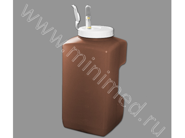 Контейнер для сбора суточной мочи, изготовлен из полиэтилена (ПЭ) янтарного (коричневого) цвета (подходит для светочувствительных анализов), с эргономичной ручкой и градуировкой. Завинчивающаяся крышка снабжена устройством для вакуумных пробирок и защитный колпачок на момент взятия пробы. Игла для отбора пробы имеет защитный чехол, изготовленный из синтетического каучука. Данная система обеспечивает гигиеничный и чистый сбор мочи из закрытой системы. Лаборант больше не должен открывать контейнеры, полученные на лабораторное исследование.
