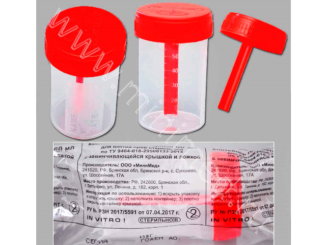 Обеспечивает полную герметичность при транспортировке биологического материала. Материал контейнера - полипропилен, крышки с ложкой - полиэтилен. Имеет градуировку и матовое окошко для записи. Стерильный.
