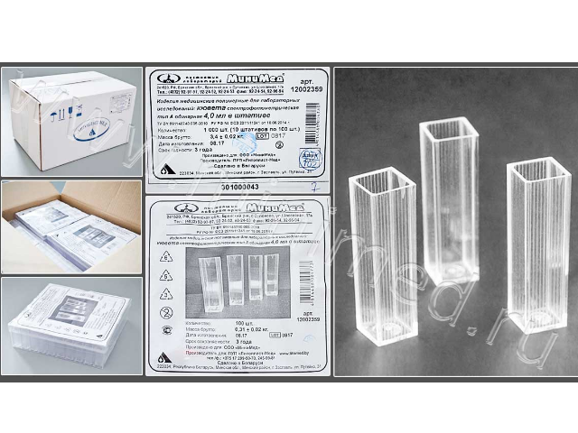 Кювета предназначена для одноразового использования, изготовлена из оптического полистирола, две оптические поверхности проницаемы для излучения диапазоном 340 - 750 нм.