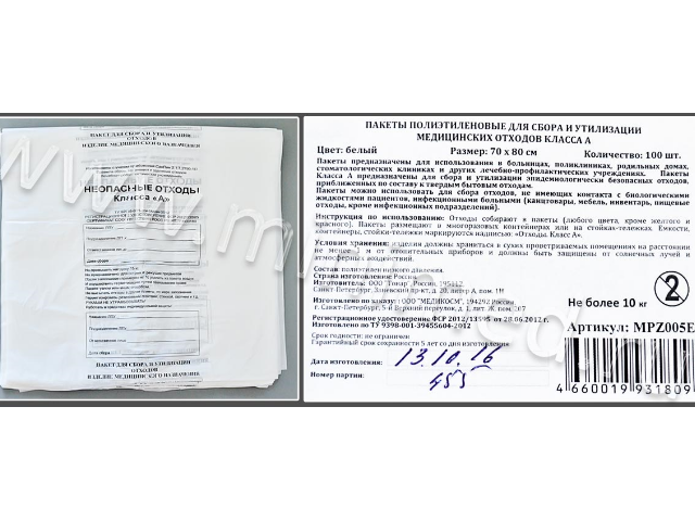 Предназначен для сбора неопасных, пищевых, нетоксичных отходов. Может использоваться в административно- хозяйственных помещениях, пищеблоках, внекорпусных территориях; палатах отделений, кроме инфекционных, кожно-венерологических, микологических. На пакете имеется информационное окно для обозначения учреждения, подразделения, даты и фамилии ответственного за сбор отходов лица (поверхность пакета позволяет производить заполнение информационного окна шариковой ручкой). На изделии нанесена ссылка на ТУ, краткая информация о производителе с адресом, контактными телефонами.