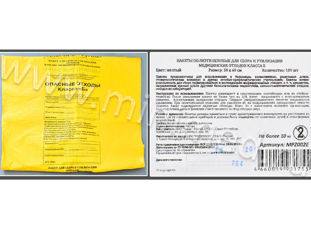 Предназначен для сбора биологически опасных, инфицированных инструментов и материалов, органических отходов (органы и ткани), патологоанатомических и биологических отходов, отходов из микробиологических лабораторий. На пакете имеется информационное окно для обозначения учреждения, подразделения, даты и фамилии ответственного за сбор отходов лица (поверхность пакета позволяет производить заполнение информационного окна шариковой ручкой). На изделии нанесена ссылка на ТУ, краткая информация о производителе с адресом, контактными телефонами. Плотность пакета 13 мкм. Пакет комплектуется стяжкой.