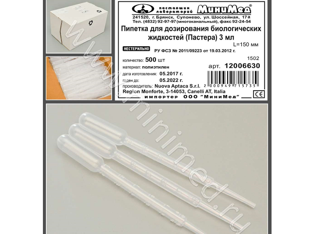 Пипетка для дозирования биологич.жидкостей (Пастера) 3 мл. н/стер.,уп.500 шт.