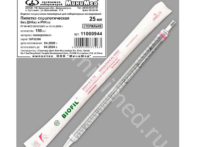 Пипетка серологическая 25 мл.,стерильная,апирогенная,без Днказ/Рнказ,инд.уп./уп.150 шт.