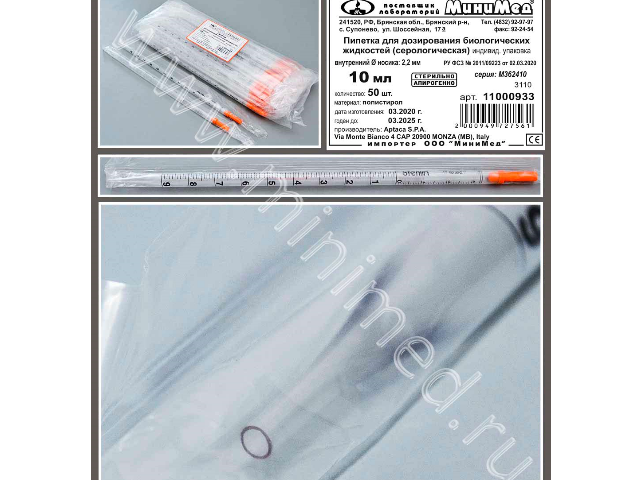 Пипетка д/дозирования биологических жидкостей (серологическая) 10 мл.,стерильная, апирогенно, инд.уп.,уп.50 шт./кор.500,п/с