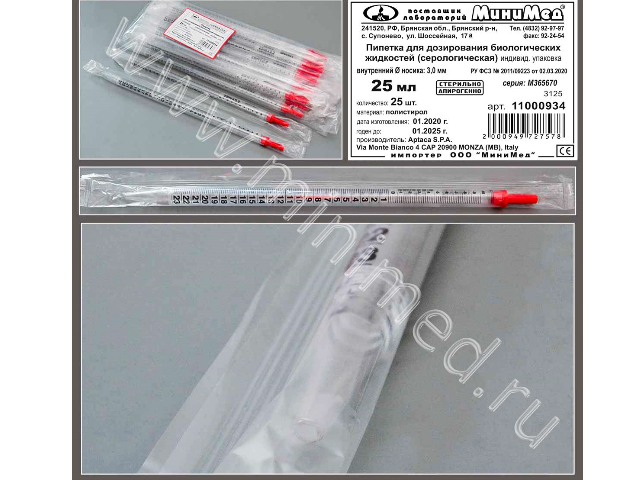 Пипетка д/дозирования биологических жидкостей (серологическая) 25 мл.,стерильная, апирогенно, инд.уп.,уп.25 шт./кор.500,п/с