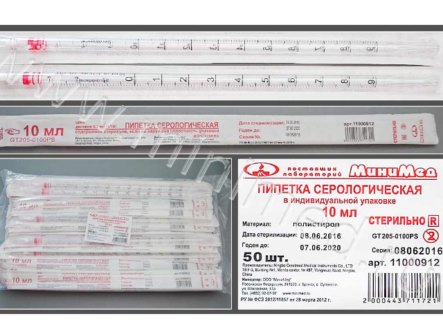 Пипетки серологические, одноразовые, изготовлены из кристаллического полистирола. Стерилизованы гамма-излучением. Цветовая маркировка кодирует соответствующий номинал согласно международным стандартам. Пипетки апирогенны, не обладают гемолитическим и цитоксическими действиями. Градуировка на пипетки нанесена черной, устойчивой к стиранию краской.