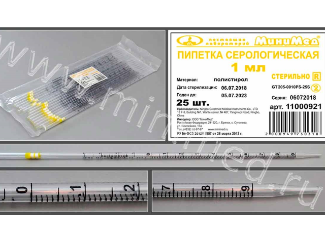 Пипетки серологические, одноразовые, изготовлены из кристаллического полистирола. Стерилизованы гамма-излучением. Цветовая маркировка кодирует соответствующий номинал согласно международным стандартам. Пипетки апирогенны, не обладают гемолитическим и цитоксическими действиями. Градуировка на пипетки нанесена черной, устойчивой к стиранию краской. Пипетки всех номиналов имеют отрицательную шкалу переполнения, продолжающую основную шкалу.