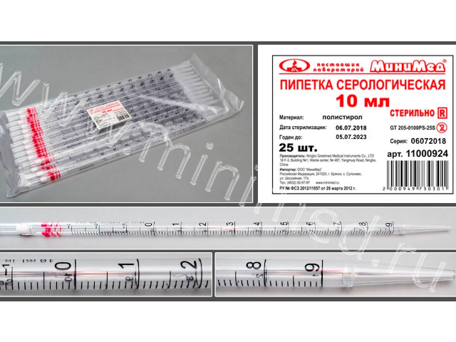 Пипетки серологические, одноразовые, изготовлены из кристаллического полистирола. Стерилизованы гамма-излучением. Цветовая маркировка кодирует соответствующий номинал согласно международным стандартам. Пипетки апирогенны, не обладают гемолитическим и цитоксическими действиями. Градуировка на пипетки нанесена черной, устойчивой к стиранию краской.