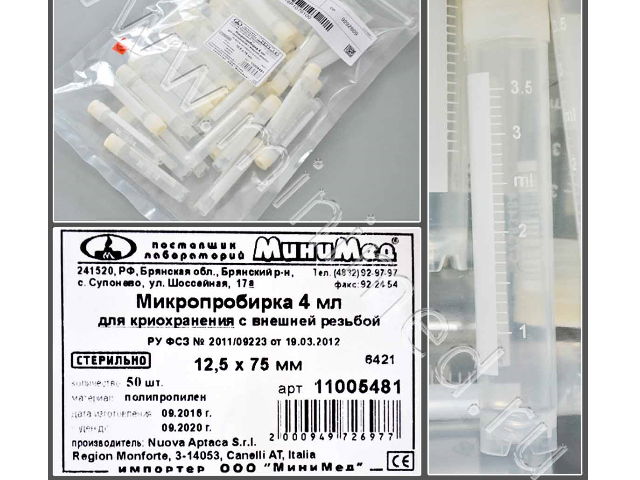 Предназначена для работ при температурах от -196 до +121° С, в т. ч. для хранения образцов в жидком азоте. Крышка с внутренней резьбой и уплотненным кольцом подходит для работы с особо опасными биоматериалами. На пробирку нанесена белая маркировка до объема 3,5 мл, цена деления 0,1 мл, имеется окошко для записи, юбка устойчивости. Общий объем пробирки 4 мл. Изготовлена из полипропилена. Стерилизована гамма-излучением.