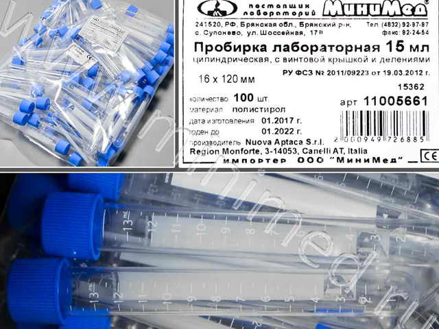 Предназначена для отбора проб, проведения химических, биологических, микробиологических анализов, в малых объемах химических реакций. Изготовлена из прозрачного полистирола, герметично укупоривается синей полиэтиленовой крышкой. На пробирку нанесена четкая градуировка. Имеется окно для записи информации. Нестерильная. Относительная центробежная сила, действующая на пробирку, не должна превышать 5000 g.
