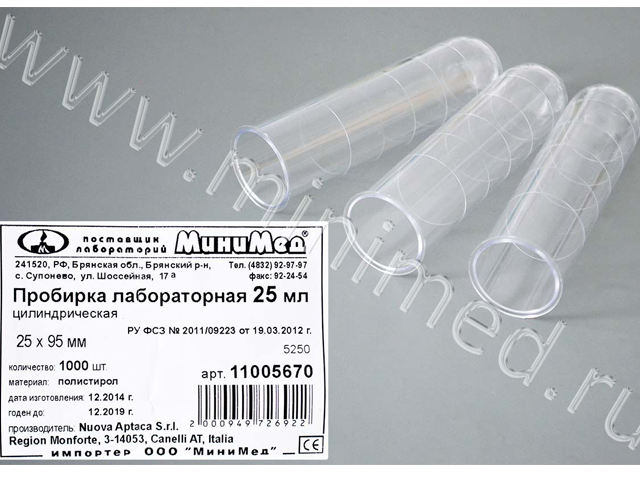 Предназначена для отбора проб, проведения химических, биологических, микробиологических анализов, в малых объемах химических реакций. Изготавливается из полистирола (неавтоклавируемые), имеется круговая градуировка для определения ориентировочного объема на 5,0-10,0-15,0-20,0-25,0 мл. Нестерильная. Относительная центробежная сила, действующая на пробирку, не должна превышать 2000 g.