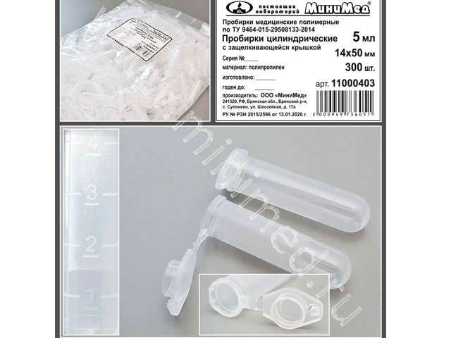 Пробирка цилиндрическая с защелкивающейся крышкой, предназначена для хранения, транспортировки биологических и иных жидкостей, проведения различных биохимических реакций. Градуировка до 4 мл, имеется окно для записи информации. Изготавливается из полипропилена. Возможно автоклавирование при темперуре +121° С. Нестерильная.