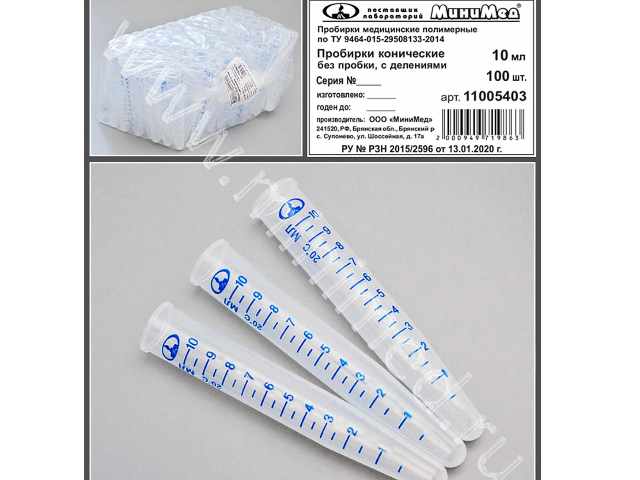 Пробирка медицинская полимерная по ТУ 9464-015-29508133-2014, коническая без пробки, 10 мл, 16х100, п/п, с делениями, уп.100шт