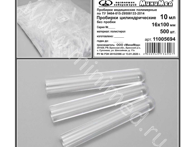 Пробирка цилиндрическая без пробки, 10 мл,16*100 мм, п/c,по ТУ 9464-015-29508133-2014, уп.500шт