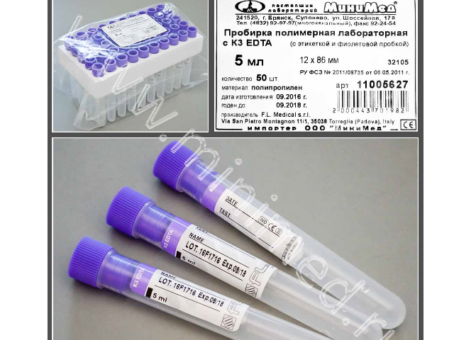 Предназначена для взятия проб крови и её гематологического исследования. Пробирка снабжена этикеткой для занесения информации о проведенном анализе. На этикетке имеется контрольная отметка уровня забираемого образца крови. Нестерильная. Антикоагулянт нанесен на стенки пробирки в виде жидкого аэрозоля в точном соответствии с объемом крови, на который пробирки рассчитаны.