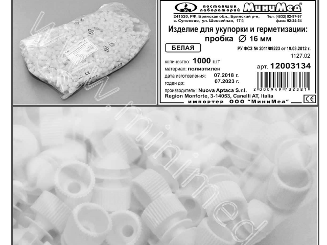 Изделие д/укупорки и герметизации: пробка диам.16 мм, белые, п/эт, уп.1000/10 тыс. шт