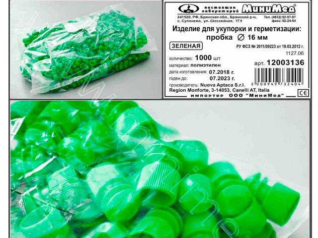 Изделие д/укупорки и герметизации: пробка диам.16 мм, зеленые, п/эт, уп.1000/10 тыс. шт