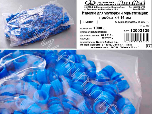 Изделие д/укупорки и герметизации: пробка диам.16 мм, синие, п/эт, уп.1000/10 тыс. шт