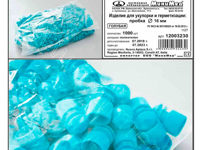 Изделие д/укупорки и герметизации: пробка диам.16 мм, голубые, п/эт, уп.1000/10 тыс. шт