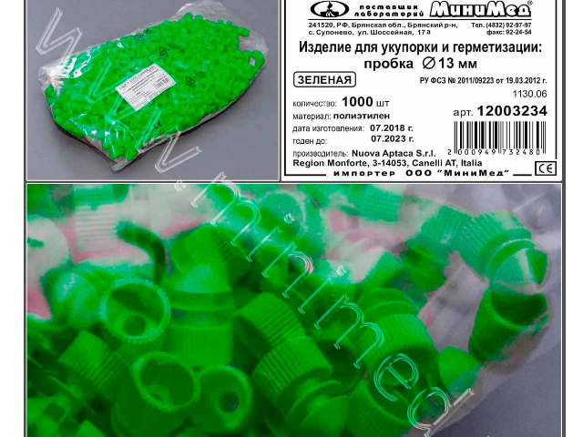Изделие д/укупорки и герметизации: пробка диам.13 мм, зеленые, п/эт,уп.1000 шт.