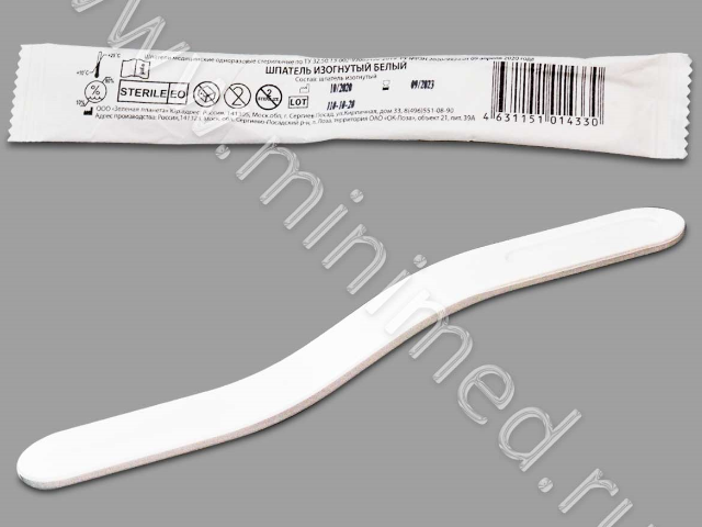 Шпатель предназначен для оттеснения языка с целью обеспечения возможности осмотра окружающих его органов/тканей при проведении осмотра полости рта и других процедур лечебного и профилактического характера. Цвет шпателя - белый. Стерилизация газовая (оксид этилен).